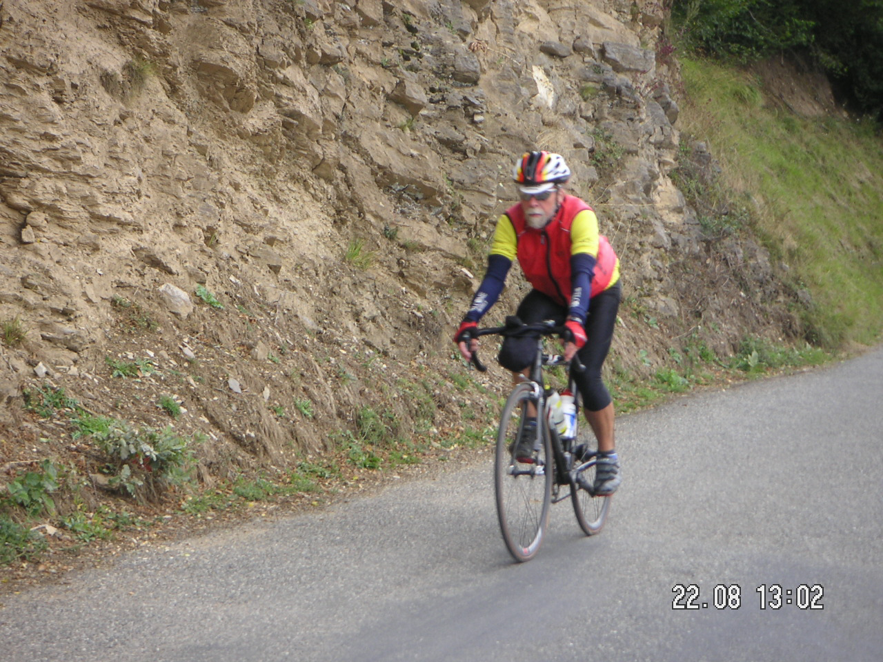 die kaum befahrene D 25 einen Rechtsbogen und steigt mit ca. 7,5% an.